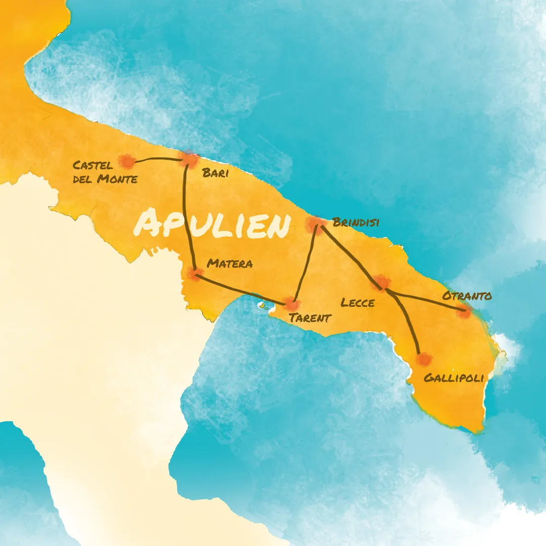 Castel del Monte und Trani - Bari´s Altstadt und Festung – Archäologische Museen in Ruvo di Puglia und Taranto – Felsenstadt Matera – Burg und Koloss von Barletta – Barockstadt Lecce – römische Spuren in Brindisi – Altstädte von Otranto und Gallipoli
